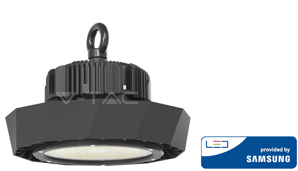 100W LED sandėlio šviestuvas UFO V-TAC, 120°, SAMSUNG LED chip, 180LM/WATT, juodas, 6400K (šaltai balta), su MEANWELL dimeriuojamu maitinimo šaltiniu
