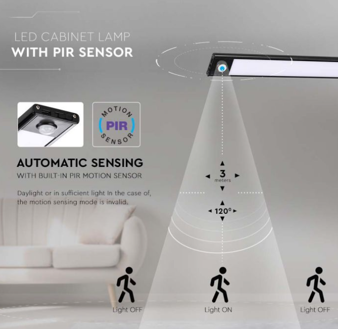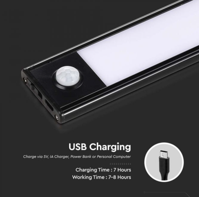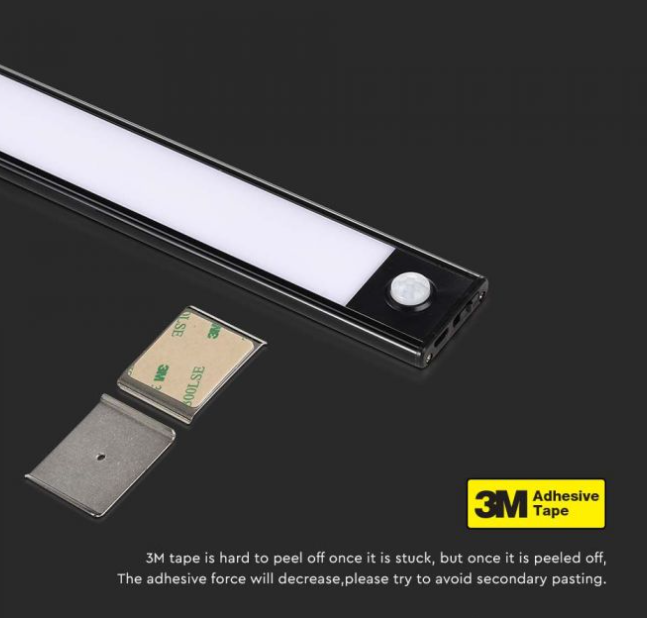 2,5W LED įkraunamas linijinis paviršinis šviestuvas, 60cm, juodas, 3000K, su judesio davikliu, automatine įsijungimo/išsijungimo funkcija. USB įkrovimas, tvirtinamas lipnia juosta.