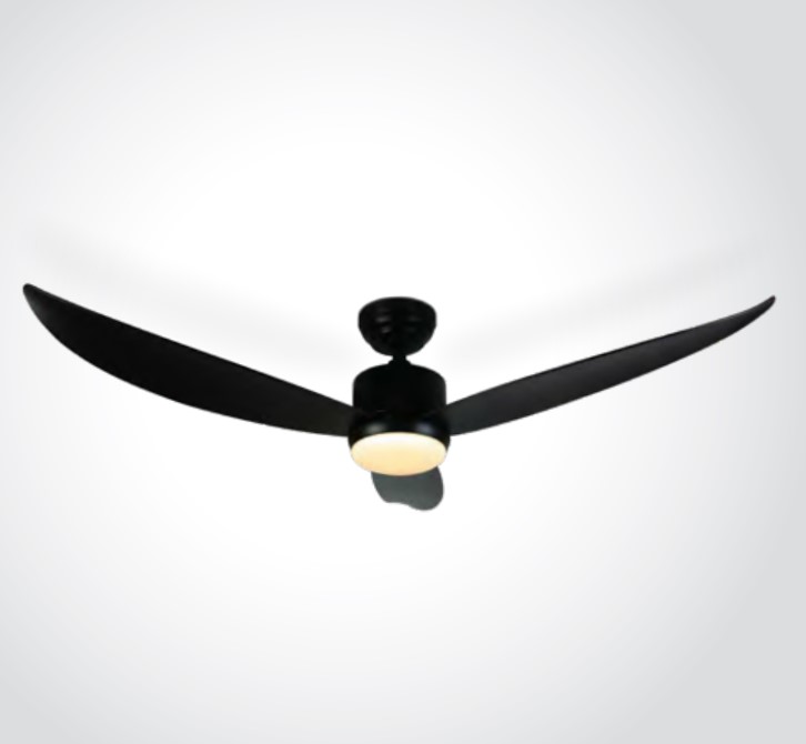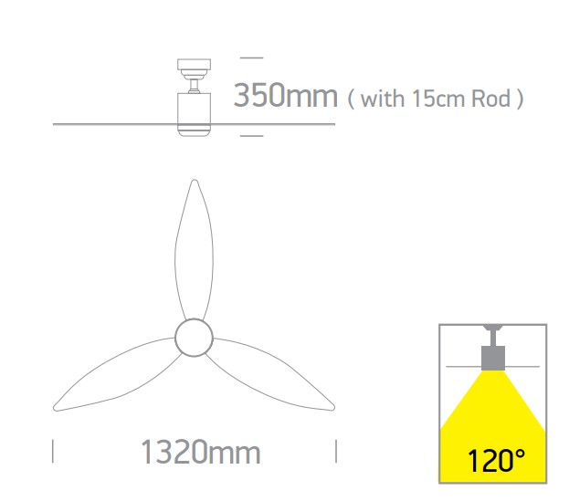 35W ventiliatorius su dimeriuojamu 22W LED šviestuvu, juodas, 3000/4000/5500K. 6 ventiliatoriaus greičiai, žiemos reversinis režimas, valdomas pulteliu. Keičiama reguliuojama dalis (strypelis) – galima keisti šviestuvo – ventiliatoriaus aukštį.