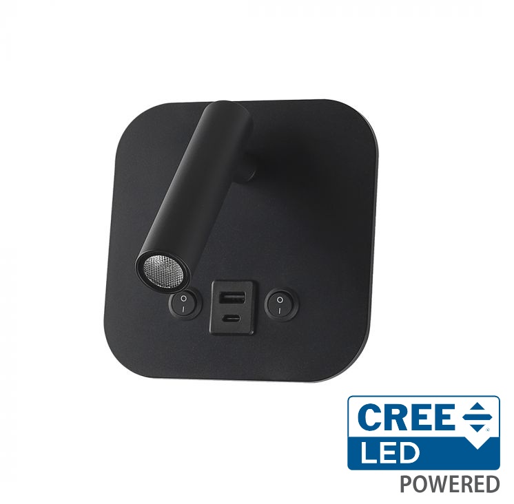 8W LED sieninis šviestuvas, juodas, 3000K, su USB/PD jungtimi, CREE LED chip