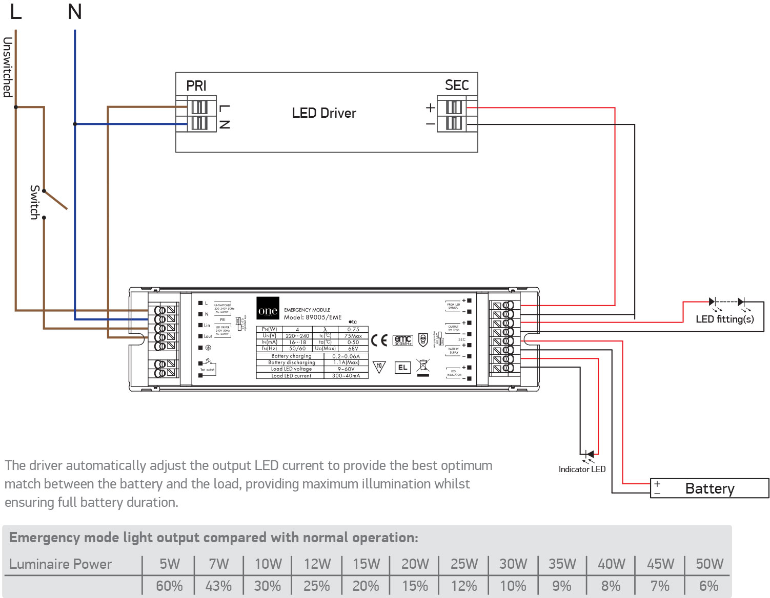 Avarinis paketas, 5-50W LED paviršiniams šviestuvams, plonas. 3 valandų palaikymas. Tiekiamas su Ni-Cd 3,6V 4,0Ah baterija.