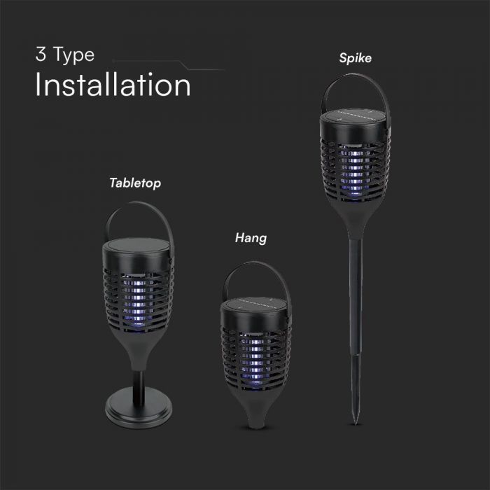 Įkraunama vabzdžių gaudyklė, 3 montavimo būdai – pastatomas, pakabinamas arba įsmeigiamas.