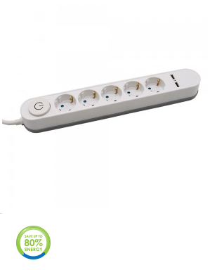 Ilgintuvas 5-vietis V-TAC, 2 usb jungtys, baltos spalvos, šviečiantis įjungimo mygtukas